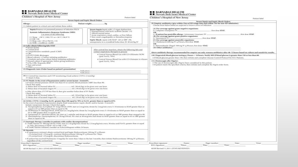 Evaluation for sepsis—screening Tool. Instructions: Use this screening tool to screen patients for sepsis. (1) Is the patient's history suggestive of a new infection: □ no □ yes, if yes suspected source □ Pneumonia, empyema □ Urinary tract infection □ Acute abdominal infection □ Meningitis □ Skin/soft tissue infection □ Bone/joint infection □ Wound infection □ Bloodstream catheter infection □ Endocarditis □ Implantable device □ Other (2) Are any two signs and symptoms of infection present AND new to the patient? □ Hyperthermia (>101°F or 38. 3°C) □ Hypothermia (<96. 8°F or 36°C) □ Tachycardia (>90 bpm) □ Tachypnea (>20 bpm) □ Acutely altered mental status □ Leukocytosis (WBC count >12, 000) □ Leukopenia (WBC count <4, 000) □ >10% immature neutrophils If the answer is yes to both questions 1 and 2, suspicion of infection is present: □ Obtain: serum lactate, blood cultures, CBC with diff, basic chemistry labs, bilirubin □ Pertinent diagnostic tests __________________ (3) Are any of the following organ dysfunction criteria present AND acute: □ SBP < 90 mm. Hg or MAP < 65 mm. Hg □ SBP decrease >40 mm. Hg from baseline □ Bilateral pulmonary infiltrates with a new (or increased) oxygen requirement to maintain Sp. O 2 > 90% □ Creatinine > 2 mg/d. L or Urine Output < 0. 5 m. L/kg/hr for more than 2 hours □ Bilirubin > 2 mg/d. L □ Platelet count <100, 000 □ Coagulopathy (INR > 1. 5 or a. PTT > 60 secs) □ Serum lactate > 2 mmol/L ➢If suspicion of infection is present AND organ dysfunction is present, the patient meets criteria for Severe sepsis. ➢If patient meets Severe sepsis criteria, AND has refractory hypotension (>60 min AND/OR unresponsive to fluid bolus of 20 m. L/kg), the patient meets criteria for Septic shock. Initiate and complete the severe sepsis protocol.