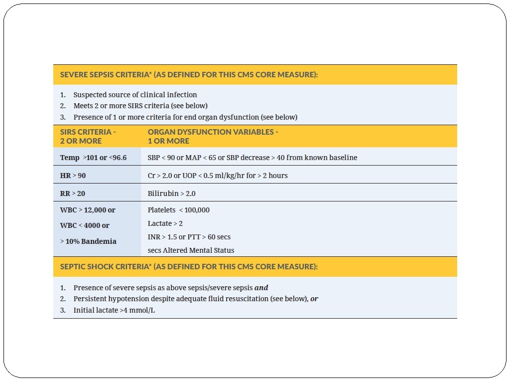 First some definitions (you can’t treat what you don’t recognize) � What is “SIRS”? Systemic inflammatory response syndrome � What is “sepsis? ” SIRS criteria (need ≥ 2 out of 4) • Temp >38. 3 C or < 36 C • HR > 90 bpm • RR >20/min or p. CO 2 <32 mm. Hg • WBC < 4000, >12000, or >10% bands • SIRS and a SUSPECTED infection � Severity of sepsis? (and why it matters) � Sepsis � Severe sepsis 20 -35% mortality � Septic shock 30 -70% mortality SEPSIS is a MEDICAL EMERGENCY