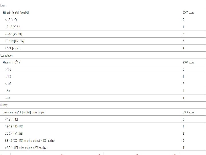 Sofa Score • A change in the SOFA score of 2 or more is now a defining characteristic of the sepsis syndrome, and the European Medicines Agency has accepted that a change in the SOFA score is an acceptable surrogate marker of efficacy in exploratory trials of novel therapeutic agents in sepsis. • The requirement to detect modest serial changes in a patients’ SOFA score therefore means that increased clarity on how the score should be assessed in different circumstances is required
