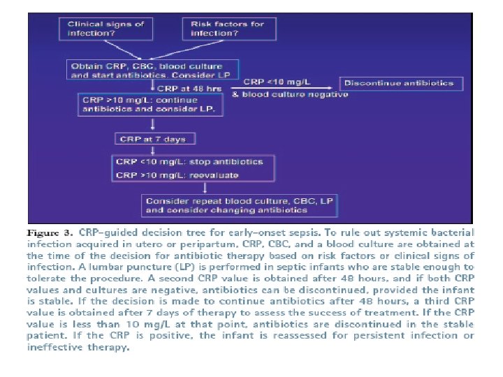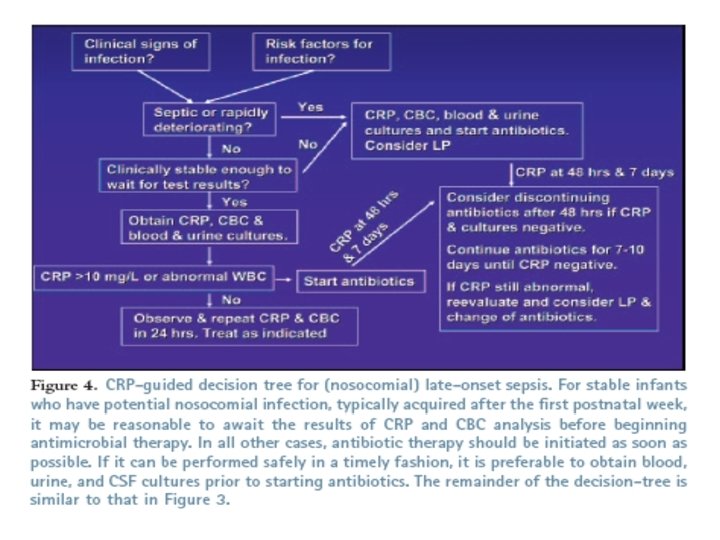 INTERPRETACIÓN DE RESULTADOS ANALÍTICOS (III) PCR SUGERENTE DE INFECCIÓN SI: > 10 mg/L • Globulina de síntesis Hepática actúa como carrier retirando material tóxico. Reacciona frente a polisacárido C del Neumococo. • Reactante de fase aguda: a las 6 -12 h de un estímulo inflamatorio, infeccioso o de daño tisular. Pico a las 36 -48 h (8 -60 h). • Vida media de 19 horas. Desciende un 50% diario tras la resolución del estímulo: fiel predictor de la eficacia del tto antibiótico. • Está elevada en el 50 -90% de los RN con infección bacteriana sistémica. • La cirugía, la asfixia, el distress respiratorio, la hemorragia intracerebral, los esteroides, las inmunizaciones, los partos vaginales instrumentales, las infecciones víricas por Herpes o Rotavirus y la neumonitis por aspiración de meconio pueden dar cifras elevadas de PCR. • Sensibilidad del 60 -82% y Especificidad del 93 -96%. VPP 95 -100%, VPN 75 -87% (Mishra UK. Arch Dis Child Fetal • Las PCR seriadas aumentan considerablemente la sensibilidad (75 -98%) y la especificidad (90%) diagnóstica así como el VPN al 99% Neonatal Ed 2006; 91: 208 -12)