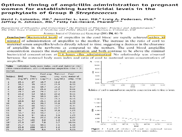 Ampicillin for neonatal group B streptococcal prophylaxis: How rapidly can bactericidal concentrations be achieved? American Journal of Obstetrics & Gynecology. 175(4): 974 -976, October 1996. Bloom, Steven L. MD; Cox, Susan M. MD; Bawdon, Roger E. Ph. D; Gilstrap, Larry C. MD Department of Obstetrics and Gynecology, University of Texas Southwestern Medical Center. Presented at the Sixteenth Annual Meeting of the Society of Perinatal Obstetricians, Kamuela, Hawaii, February 4 -10, 1996. Steven L. Bloom, MD, Department of Obstetrics and Gynecology, University of Texas Southwestern Medical Center, 5323 Harry Hines Blvd. , Dallas Figure 1. Maternal serum concentrations of ampicillin from 3 to 67 minutes after intravenous administration in 40 women at term undergoing elective repeat cesarean delivery. MBC, Minimum bactericidal concentrations for group B streptococci. Figure 2. Cord blood and amniotic fluid ampicillin concentrations in relation to elapsed time from intravenous maternal administration. MBC, Minimum bactericidal concentrations for group B streptococci.