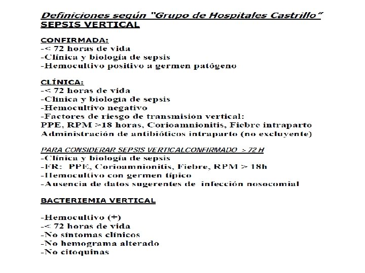 DEFINICIONES (GRUPO de HOSPITALES CASTRILLO) • SEPSIS NEONATAL: evidencia de infección (cultivo positivo) en presencia de SRIS neonatal: López Sastre JB et al. Sepsis en el periodo neonatal. Evid Pediatr 2008; 4: 68 v Sintomatología clínica (aspecto séptico y/o ≥ 2 signos o síntomas de infección), y Signos clínicos de infección An Pediatr (Barc) 2006; 64(4): 341 -8 – Respiratorios: taquipnea, tiraje, quejido, apneas – Hemodinámicos: cianosis, palidez, hipotensión, taquicardia, bradicardia, mala perfusión periférica – Gastrointestinales: rechazo tomas, vómitos, distensión abdominal, hepatomegalia, – Hematológicos: anemia, ictericia, petequias, equimosis – Neurológicos : hipotonía, irritabilidad, letargia, convulsiones – MALA REGULACIÓN de la TEMPERATURA v Alteraciones analíticas: – Recuento leucocitario anormal (según Manroe et al) y/o – PCR > 10 -12 mg/L; y/o – PCT ≥ 3 ng/m. L • SEPSIS VERTICAL CLÍNICA: SRIS neonatal con cultivo negativo, de probable etiología infecciosa: - Presencia de factores de riesgo de transmisión vertical; y/o - Aislamiento de patógenos en canal genital materno o en exudados periféricos (faríngeo, ótico) del RN, tomados en las primeras 24 horas de vida.