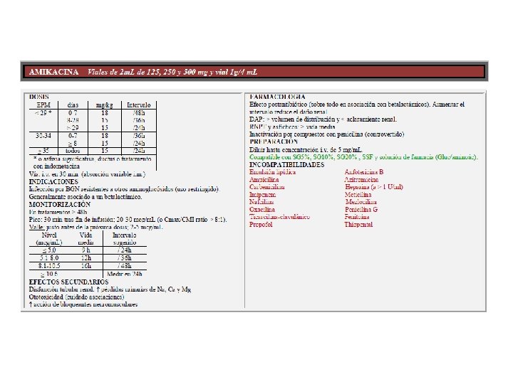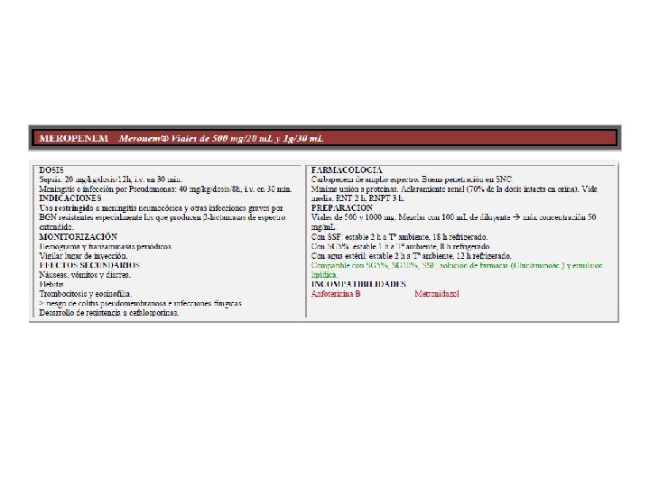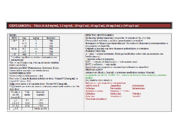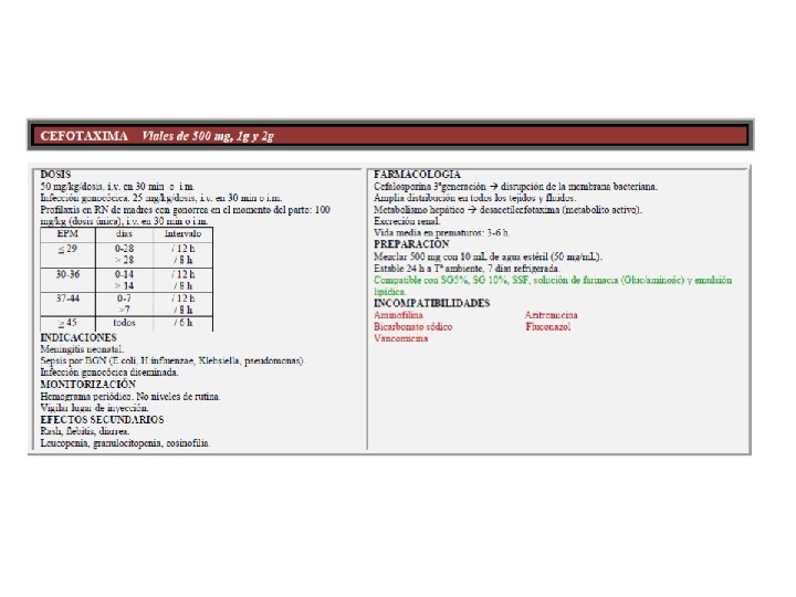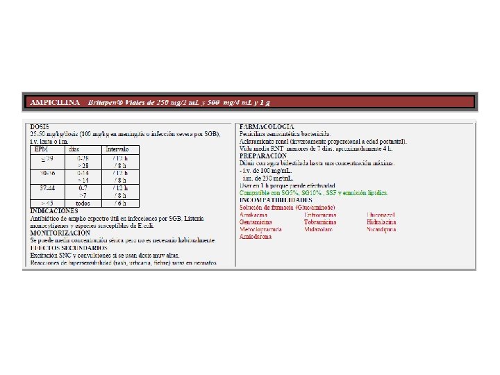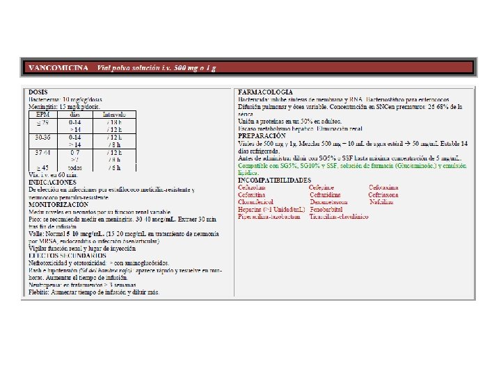 SEPSIS DE TRANSMISIÓN VERTICAL. TRATAMIENTO: • Iniciar ante la SIMPLE SOSPECHA de sepsis vertical. • Ampicilina y Gentamicina como 1ª elección. Empiric Use of Ampicillin and Cefotaxime, Compared With Ampicillin and Gentamicin, for Neonates at Risk for Sepsis Is Associated With an Increased Risk of Neonatal Death. Reese H. Clark, Barry T. Bloom, Alan R. Spitzer, and Dale R. Gerstmann. Pediatrics 2006; 117: 67 -74. • Ampicilina y Cefotaxima si se sospecha meningitis. • ¿Obtención de NIVELES SÉRICOS (M de Hoog. Seminars in Fetal and Neonatal Med 2005; 10, 185 -94)? : – – Vancomicina: Sólo medir niveles VALLE (5 -10 mcg/m. L) y sólo en PREMATUROS (<37 semanas). Aminoglicósidos: Medir niveles SÓLO en caso de Ductus, fallo renal, asfixia, ECMO o uso de Indometacina, pues: • • • Con métodos manuales el 96% de los hemocultivos positivos se obtienen a las 48 horas y el 98% a las 72 h; y más precozmente con sistemas automatizados → a término asintomáticos con hemocultivo estéril a las 36 horas de incubación y 2 PCRs <10 mg/L: SUSPENDER ANTIBIOTERAPIA. Clin Perinatol 37(2010) 421 -438 Una vez confirmada la sepsis con el hemocultivo, el tratamiento antibiótico se fundamentará en el ANTIBIOGRAMA. • • Ni eficacia ni toxicidad correlacionada en Neonatos con niveles séricos. Nefro u Ototoxicidad excepcional (y reversible) en Neonatos sometidos a cursos de tratamiento ≤ 7 días. Duración: – – 7 -10 días en las sepsis por Gram + (estafilococo, estreptococo…). 14 días si Listeria o Gram - (E. Coli, Klebsiella…).