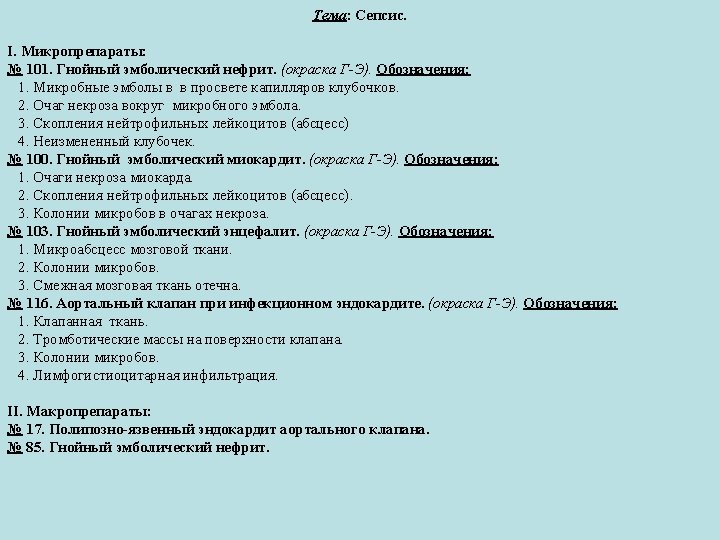 Sepsis. I. Microspecimens: № 101. Purulent embolic nephritis. (H. E. stain). Indications: 1. Microbes emboli in the lumen of glomerular capillaries. 2. Focus of necrosis around the microbial embolus. 3. Clusters of leukocytes (abscess). 4. Unchanged glomerulus. № 100. Purulent embolic myocarditis. (H. E. stain). Indications: 1. Foci of myocardial necrosis. 2. Clusters of leukocytes (abscess). 3. Colonies of microbes in necrotic foci. № 103. Purulent embolic encephalitis. (H. E. stain). Indications: 1. Microabscess in brain tissue. 2. Colonies of microbes. 3. Adjacent edematous cerebral tissue. № 116. Aortic valve in bacterial endocarditis. (H. E. stain). Indications: 1. Valvular tissue. 2. Thrombotic masses on the surface of the valve. 3. Colonies of microbes. 4. Lympho-histiocytic infiltration. II. Macrospecimens: № 17. Ulcerative-polypous endocarditis of aortic valve. № 85. Purulent embolic nephritis.