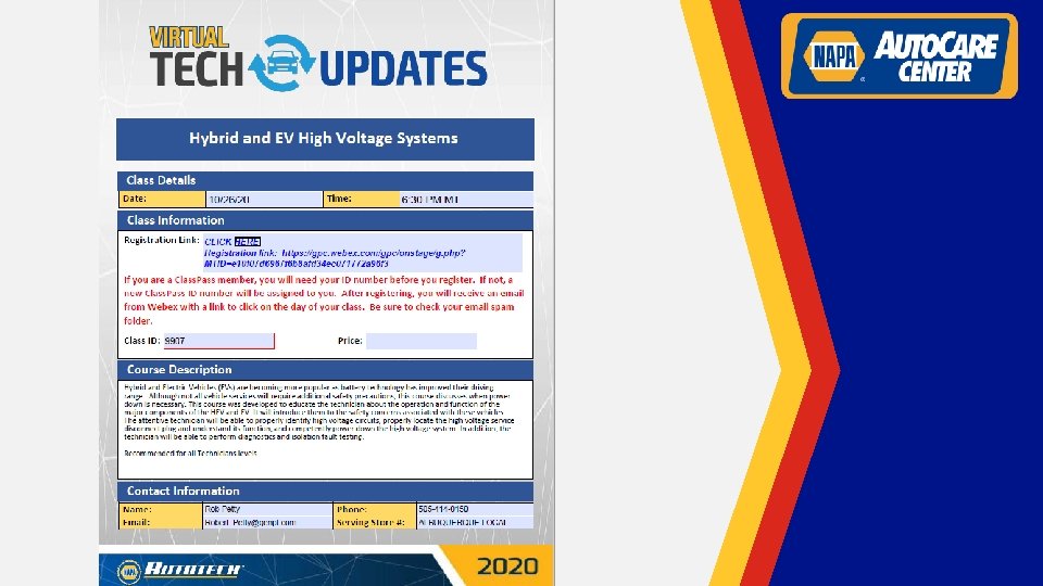 Auto Tech Virtual Classes • Auto. Tech classes are currently being offered virtually at this time. • Upcoming class: Hybrid & EV High Voltage System. • Class Date: October 26 th