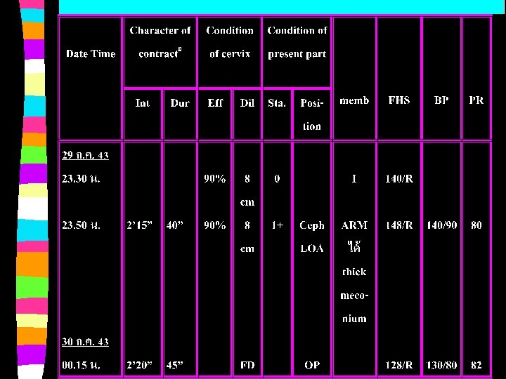 Labour record (Day 3 after admission) -Abnormal delivery, position - LOP -Procedure: Low F/E (right mediolateral episiotomy with subcuticular suture( -Indication: thick meconium amniotic fluid stain -Newborn: male, alive, 2850 g, 49. 5 cm. APGAR score 1 min. = 6 5 min. = 9 ������� ET tube for suction ��� O 2 ���� -Postpartum condition: normal