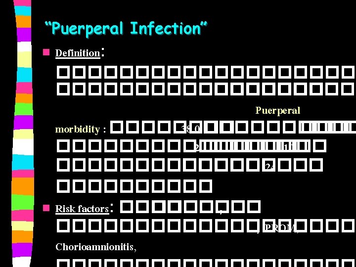“ Puerperal Infection” n n Treatment - Specific - Supportive - Symptomatic Prevention - �������� - ��� prophylactic antibiotics �����������������
