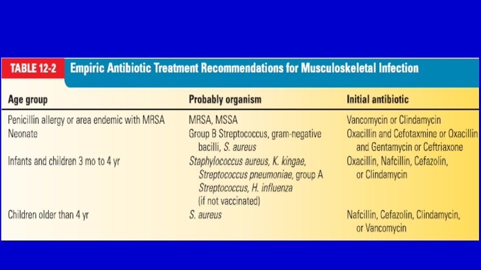 Common organism • Neonate • Group B strep, gonococci, S. aureus, coliform bacteria (gram negative) • Unimmunized infants younger than 2 yrs • H. influenzae, group A strep, K kingae, S. aureus • Immunized infants and older children • S. aureus , pneumococcus, group A strep