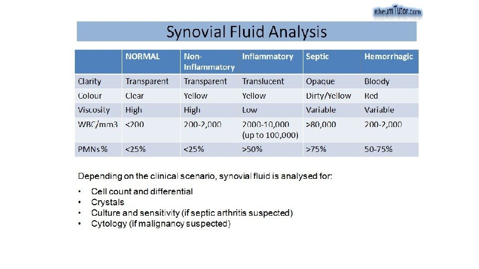 Investigation: : CBC -----( elevated WBC) CRP ESR Imaging: : X-Ray : -widening of the joint space (due to the effusion) -Later, when the articular cartilage is attacked, the ‘joint space’ is narrowed confirmed by joint aspiration and immediate microbiological culture and sensitivity. Blood cultures - In advanced cases there are signs of bone destruction. Radio-isotope imaging and MRI are helpful for detecting signs in difficult sites such as the sternoclavicular and sacroiliac joints.