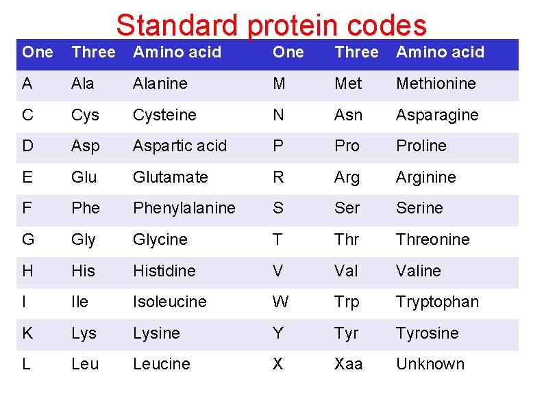 Standard protein codes One Three Amino acid A Alanine M Methionine C Cysteine N Asn Asparagine D Aspartic acid P Proline E Glutamate R Arginine F Phenylalanine S Serine G Glycine T Threonine H Histidine V Valine I Ile Isoleucine W Trp Tryptophan K Lysine Y Tyrosine L Leucine X Xaa Unknown