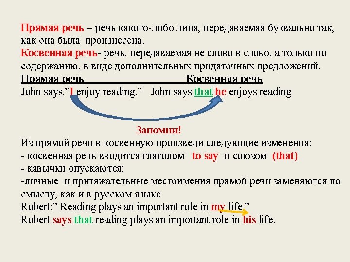 Задание на закрепление I. Put these statements into Reported Speech. 1) ‘I can’t swim very well’, I said. 2) Andrew said: ’I don’t want to go swimming’. 3) ‘I’ll phone you later’, Sarah said. 4)Annie said: ‘I’m hungry’. 5) I told him: ‘I don’t like tea’. 6) Olaf said: ‘My father does a lot of business with England’. 7)The woman said: ‘I will pay you two pounds’. 8) She said to Lilian: ‘You can come with me’ 9) He said: ‘I don’t think it will be interesting’. 10) My friend told me: ‘You can go there for a year’. 11) She said: ‘Nothing will make me do it’. 12)Mike said: ‘My friend is a painter’. 13) She said: ‘I am good at painting’. 14)’I will have lunch on Saturday’, he said. 15) The teacher said: ‘I will give you a new task on Reported Speech’.