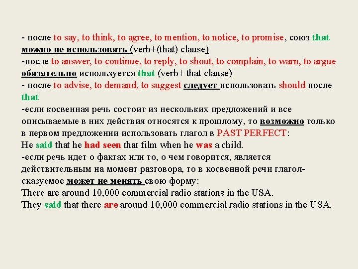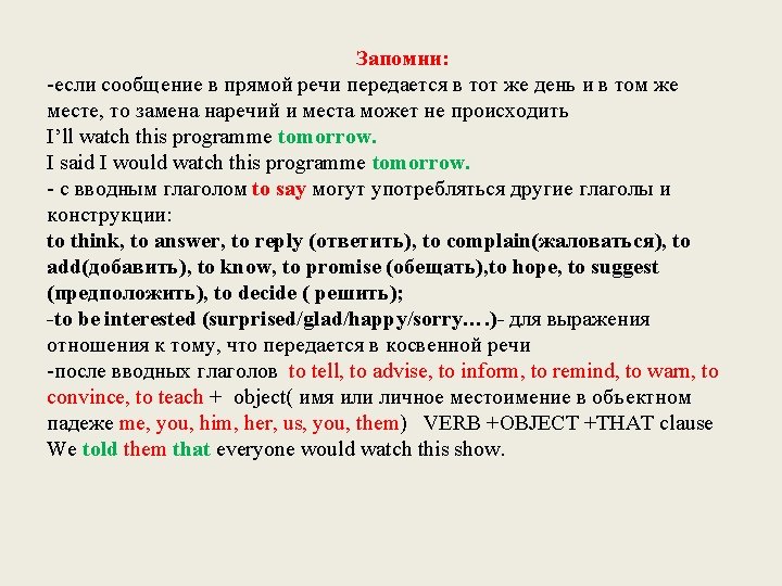 Sequence of tenses(Согласование времен) Direct speech Present Simple I don’t like watching TV. Present Progressive I am watching TV. Present Perfect I have seen this show. Present Perfect Progressive I have been watching TV for 2 hours. Past Simple I saw this show yesterday. The show started in 2000. Reported speech Past Simple He said that he didn’t like watching TV. Past Progressive He said that he was watching TV. Past Perfect He said that he had seen that show. Past Perfect Progressive He said that he had been watching TV for 2 hours Past Perfect He said that he had seen that show the day before. He said that show started in 2000. (если указано время совершения действия) Past Progressive Past Perfect Progressive Yesterday at 5 p. m. . I was watching my favourite show. He said that he had been watching his favourite show at 5 p. m. the day before. Past Perfect I had watched 2 of my favourite TV shows by 4 p. m. He said that he had watched 2 of his favourite TV shows by 4 p. m. Future Simple Future in the Past I will watch this show tomorrow. He said that he would watch that show the next day. To be going to I’m going to watch TV tonight. She said that she was going to watch TV that night.