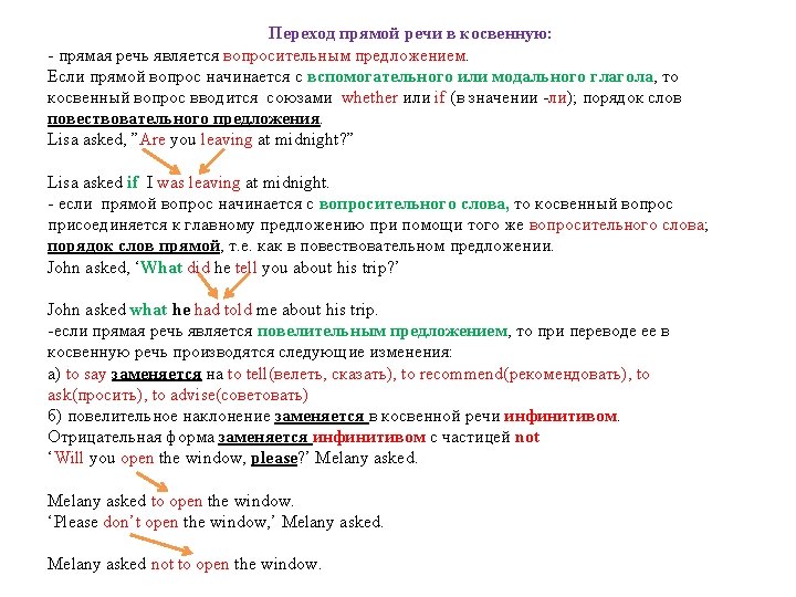 III. Turn the speaker’s words into Reported Questions. (General Questions) 1) I asked: ‘Are you cold? ’ 2) She asked: ‘Do you want a drink? ’ 3) They wanted to know: ‘Can you speak German? ’ 4) She asked: ‘Ken, are you on duty? ’ 5) He asked: ‘Nelly, did you say that? ’ 6) the man asked: ‘Will it take you long to repair the car? ’ 7) Nick asked: ‘Have you got a double room? ’ 8) A man asked: ‘May I come in? ’ 9) Hob asked: ‘Shall I taste your cake? ’ 10) The teacher asked the pupils: ‘Can you do this exercise? ’ 11) My mother asked: ‘Will you taste my pie? ’ 12) He asked: ‘Have you ever been to Venice? ’ 13) Mrs. Wiggins: ‘James, did you hear what Grandpa said? ’ 14) My father wanted to know: ‘Will you tell me the truth? ’ 15)The teacher asked us: ‘Do you understand? ’