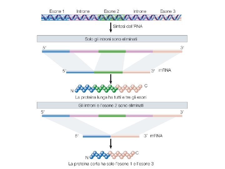 Definizioni • Esoni: sequenze rappresentate nell’RNA maturo • Introni: sequenze rimosse dal trascritto primario
