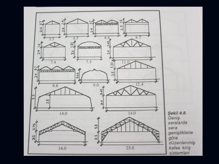 n n n n Çatı kirişleri: Çatıdan gelen yüklerin kolonlara iletilmesine yarar. Belirli aralıklarla kolonlar üzerine yerleştirilir. Kiriş aralıkları 3 m dolayındadır. Aşıklar: Kolonları birleştirirler. Mahya aşığı: Kirişlerin sera çatısına birleştiği yerde, mahya aşığı yardımıyla kirişler birbirlerine birleştirilir. Mertekler: Aşıklar üzerine yerleştirilen mertekler üzerine sera örtü malzemesi yerleştirilir. Sera havalandırmasında kullanılan çatı pencereleri de mahya ve aşıklar tarafından taşınır. Su olukları: Çatıya gelen yağış sularının uzaklaştırılmasını sağlar. Seranın dışında yer alır. Damlalıklar: Özellikle plastik seralarda iç kısımda yoğunlaşan su damlalarını toplarlar. Bitki düzenekleri: Fazla ısı ve ışık isteyen tavana asılan bitki düzeneklerinden oluşurlar.