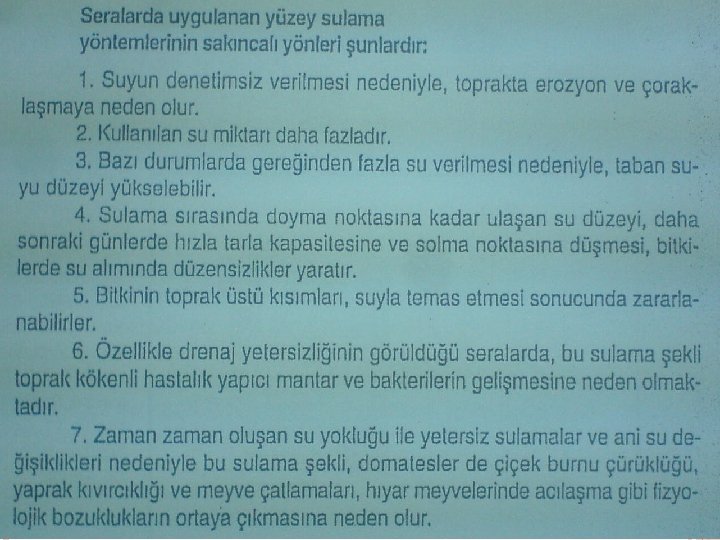 YÜZEY SULAMA SISTEMI Yüzey sulama sistemleri pek fazla seralarda tavsiye edilmez. Çünkü yararından çok zararı bulunur. Ancak seralar tava getirilmesi ve toprak yıkama işlemi yapılacağı zaman kullanılır. Zararlarını şöyle sıralaya biliriz;