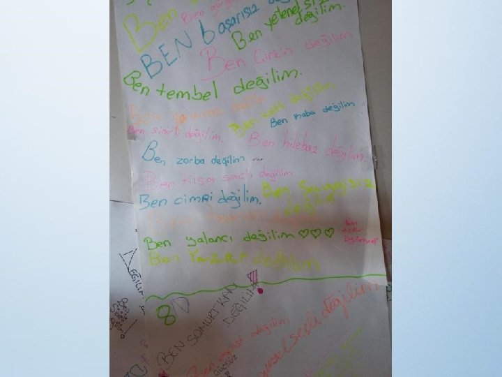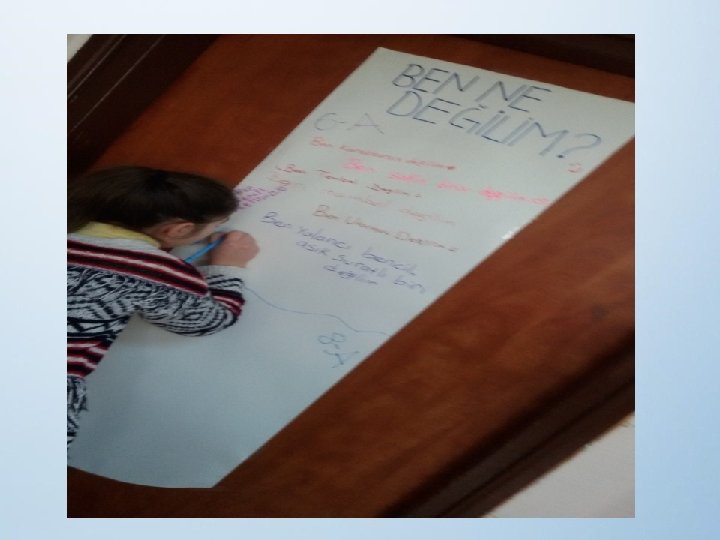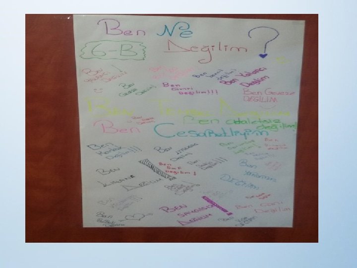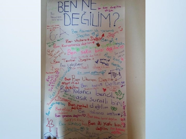 4)BEN NE DEĞİLİM • Temel amaç öğrencinin ne olduğu değil, ne olmadığı üzerinde düşünmesidir. • Sınıf kapılarına kağıt asılarak her öğrencinin fikirlerini özgürce ifade etmesi istenmiştir.