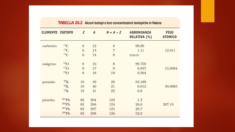 Nuclei stabile e isotopi radioattivi Un elemento con un dato numero atomico Z può tuttavia avere atomi con differenti numeri di neutroni nel nucleo. Tuttavia solo alcune di queste configurazioni sono stabili. Chiamiamo isotopi di un elemento tutte le configurazioni con diverso numero di neutroni. Le configurazioni non stabili vengono chiamate isotopi radioattivi. Notiamo che esistono elementi con più di 92 protoni nel nucleo, ma che non hanno isotopi stabili. La somma del numero di protoni e del numero di neutroni in un atomo viene detto peso atomico o numero di masssa (indicato con A nel grafico).
