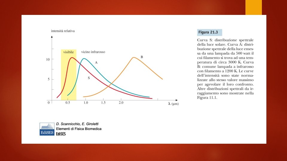 Emissione termica Un corpo solido o liquido emette radiazione elettromagnetica a causa dell’agtazione termica. E’ su questo principio che funzionano i termometri senza contatto all’infrarosso. L’emissione ha un andamento spettrale come quello in figura e l’ntensità della radiazione emessa è data dall’equazione di Stefan-Boltzmann dove k≤ 1 dipende dal corpo e σ è una costante. Il picco si ha lunghezza d’onda (legge di Wien)