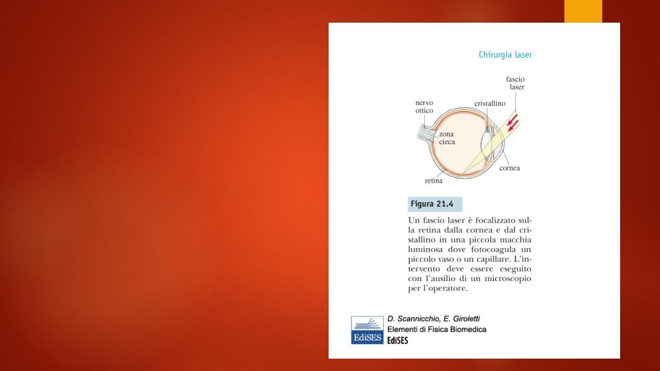 Onde elettromagnetiche in medicina Campi e. m. a bassa frequenza, radiofrequenza e microonde: non sono ionizzanti, possono avere un effetto termico sui tessuti. Sono utilizzati per alcuni interventi terapeutici (p. es. tumori al fegato e al polmone) La radiazione infrarossa: è utilizzata sia per uso terapeutico che diagnostico (fotografia all’infrarosso, termometri all’infrarosso) La radiazione visibile: oltre agli strumenti di cui ci siamo occupati in Ottica, c’è il laser, usato anche per interventi chirurgici e in oftalmologia per evitare il distacco della retina I raggi ultravioletti: sono debolmente ionizzanti I raggi X: sono ionizzanti, e quindi pericolosi, ma sono importantissimi come strumento diagnostico (le radiografie) La radiazione gamma: sono fortemente ionizzanti