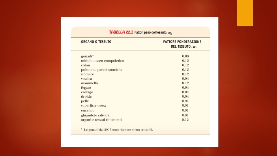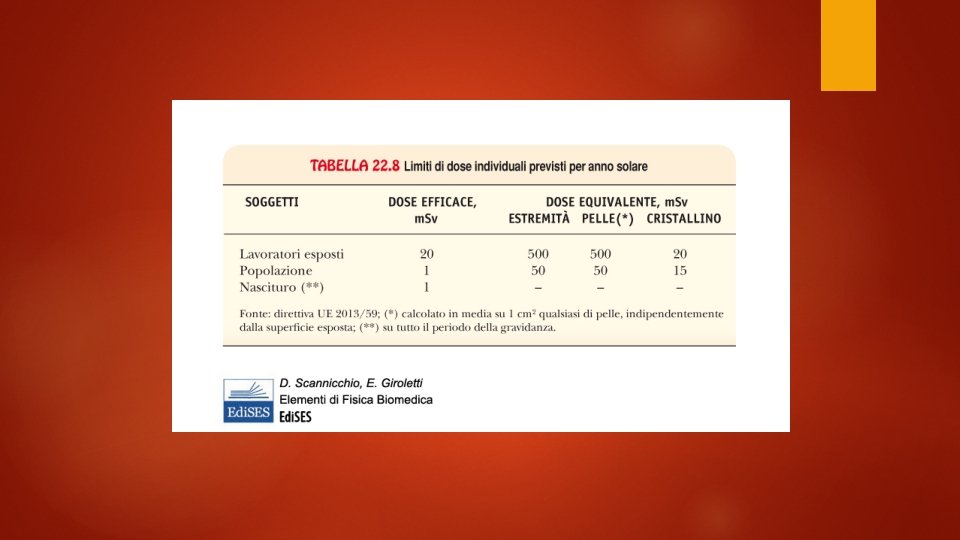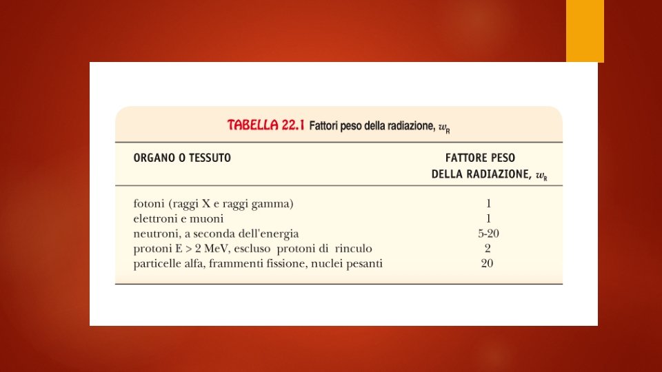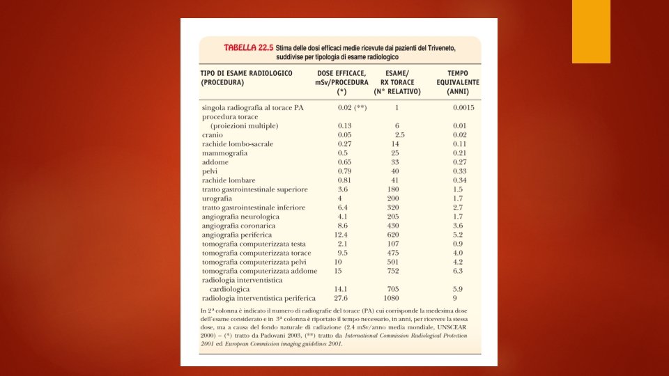 Dosimetria La dose assorbita D, ovvero la quantità di energia depositata nell’unità di massa è misurata nel S. I. in grey (Gy). E’ indipendente dal tipo di radiazione. La dose equivalente HT tiene conto del tipo e dell’energia della radiazione che ha irraggiato il singolo organo o tessuto. L’unità di misura della dose equivalente nel S. I. è il sievert (Sv). Dipende dal singolo tessuto La dose efficace E è una media pesata per tutti i tessuti di interesse. Si misura anche questo in sievert.
