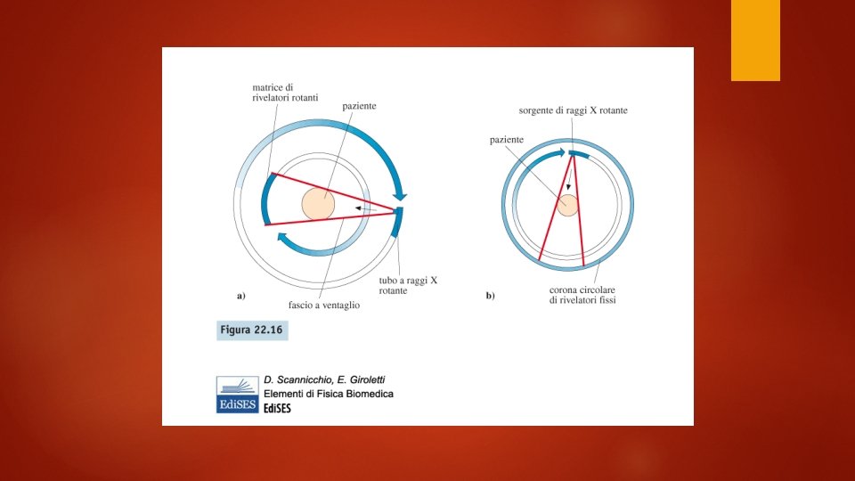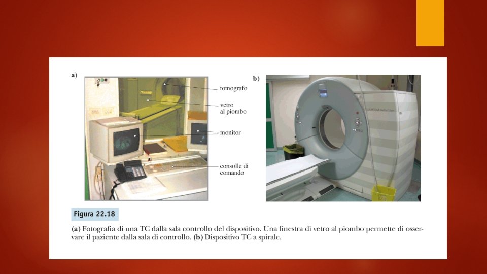 Tomografia e piani tomografici Le tomografie possono essere fatti con diversi tipi di radiazioni: o con i raggi X (TC) o con fotoni gamma (SPECT, ovvero Single Photon Emission Computed Tomography) o con emissione di positroni (PET ovvero Positron Emission Tomography) o A Risonanza Magnetica
