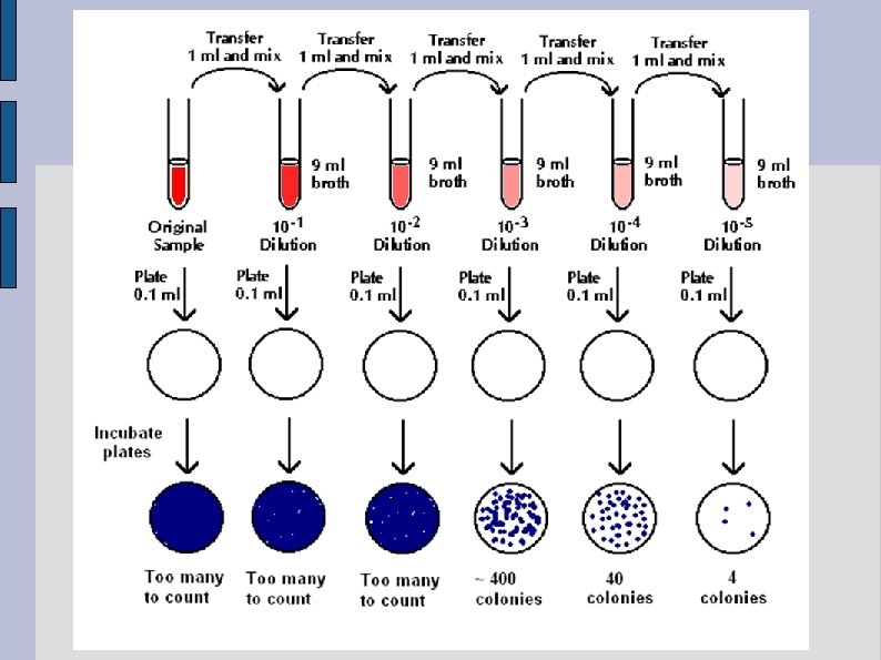 Serial dilution and colony counting ● Serial dilution (cont. ) – – – Diluted samples are spread onto media in petri dishes and incubated Colonies are counted. The concentration of bacteria in the original sample is calculated (from plates with 25 – 250 colonies, from the FDA Bacteriological Analytical Manual. A simple calculation, with a single plate falling into the statistically valid range, is given below: