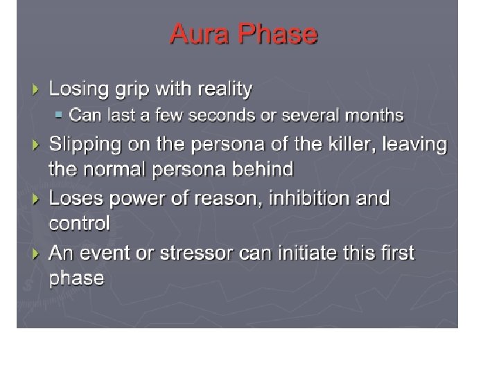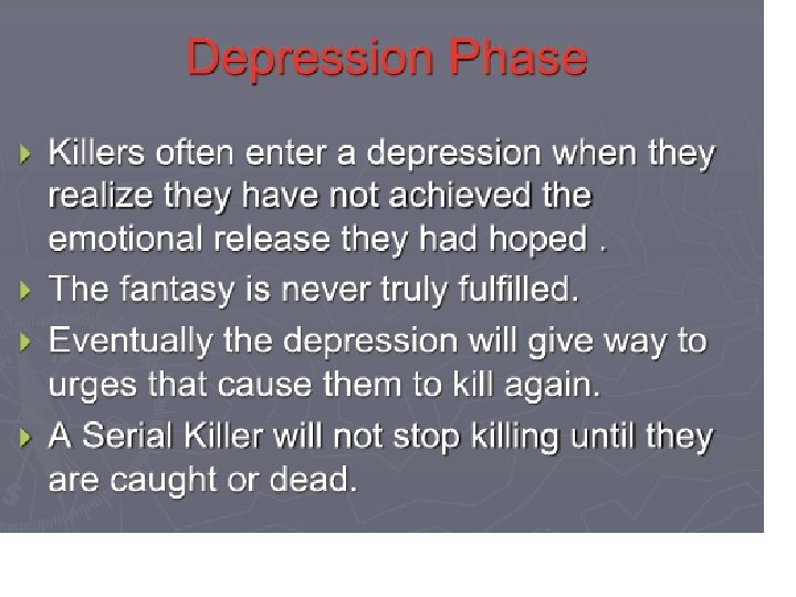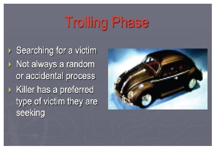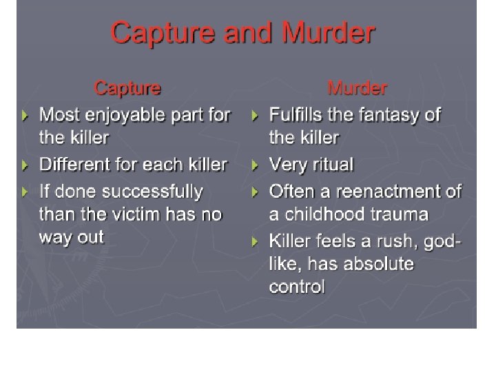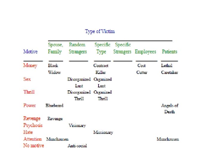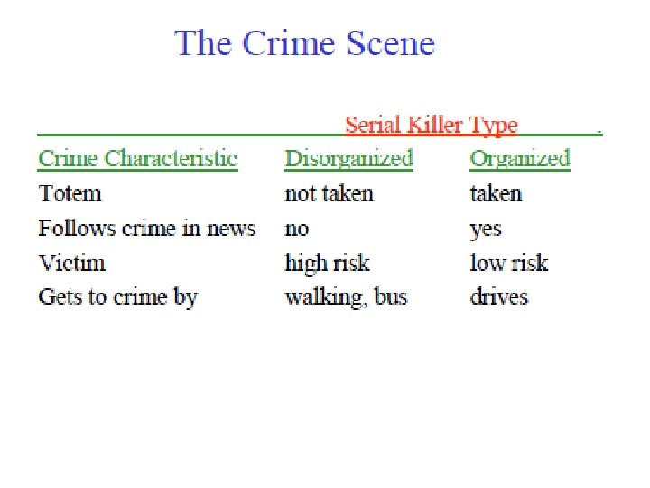 What to look for • Signature – Signature - something done to fulfill or satisfy the offenders emotional state – Not the same as Modus Operandi – Modus Operandi - what is needed to complete the crime