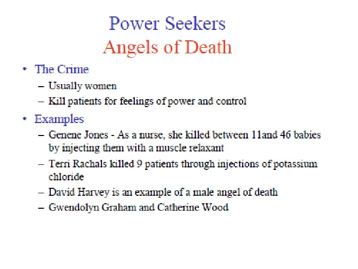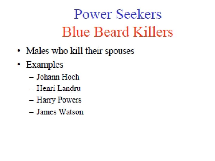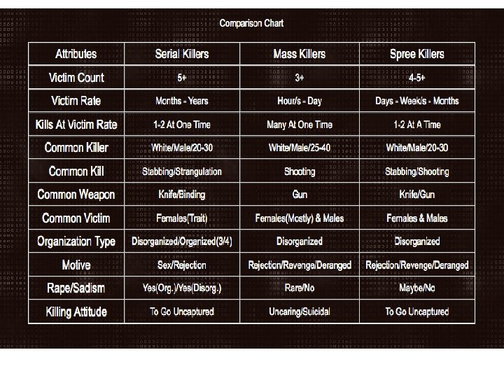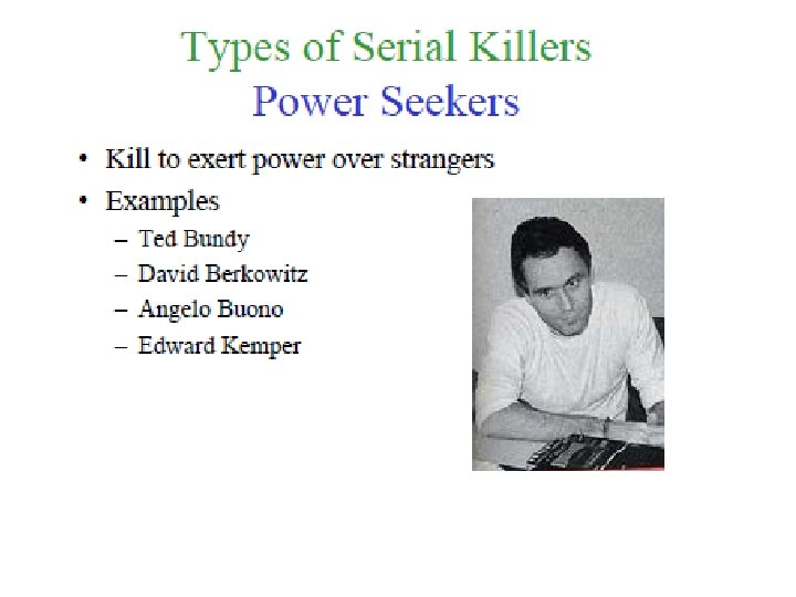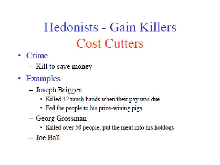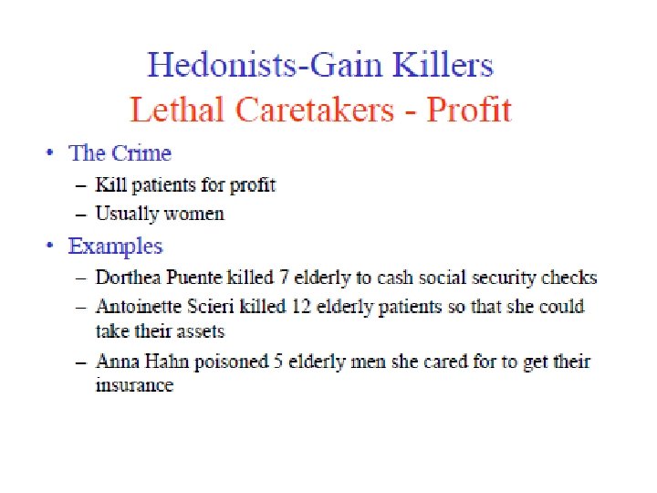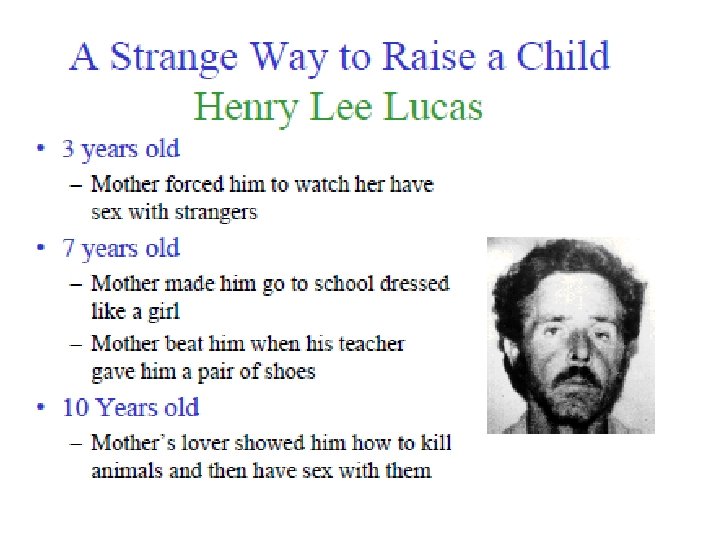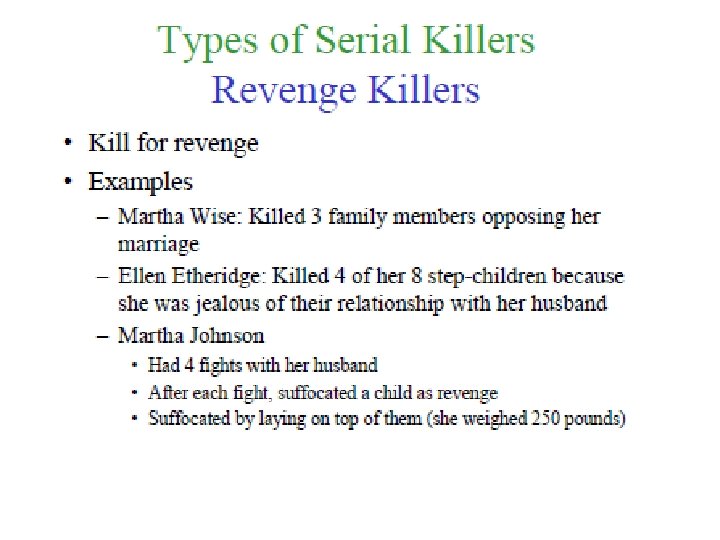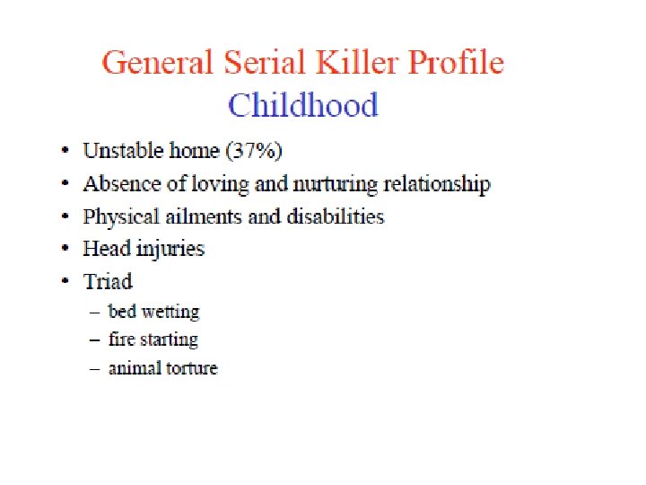 General Serial Killer Profile • • • Demographics – Average is 29. 1 • Males – 28. 9 is average at first kill • 9 is the youngest (Robert Dale Segee) • 72 is the oldest (Ray Copeland) – Jesse Pomeroy (Boston in the 1870 s) • Killed 2 people and tortured 8 by the age of 14 • Spent 58 years in solitary confinement until he died • Females – 30. 3 is average at first kill • 11 is youngest (Mary Flora Bell) • 66 is oldest (Faye Copeland)