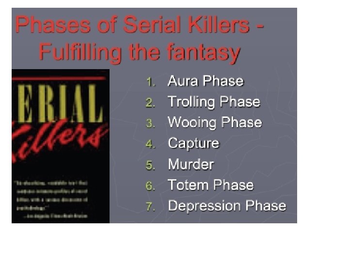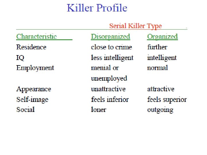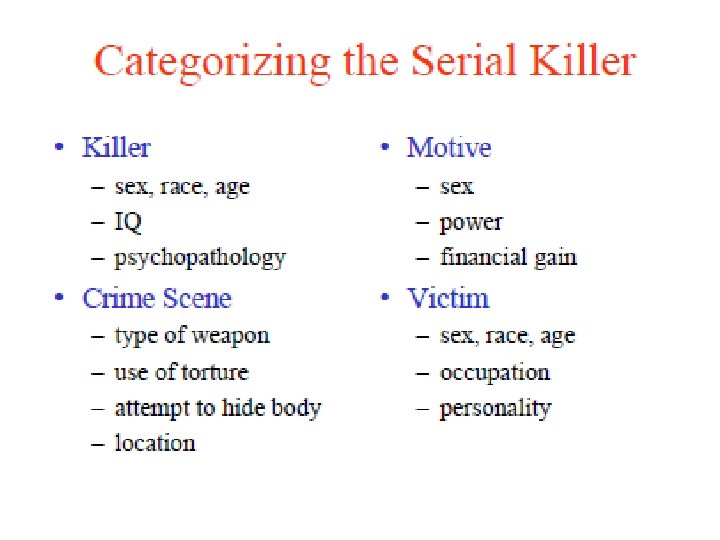 What is criminal profiling? • Construction of a psychological, behavioral and demographic profile of the type of person likely to have committed the crime • Usually applied to serial crimes (serial murders, serial rapes…)