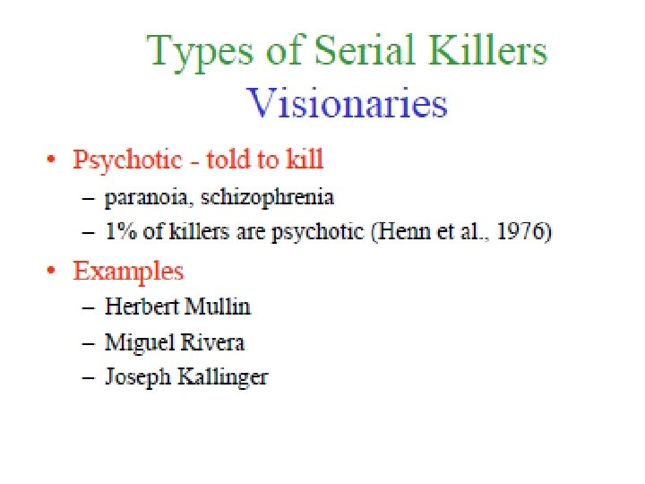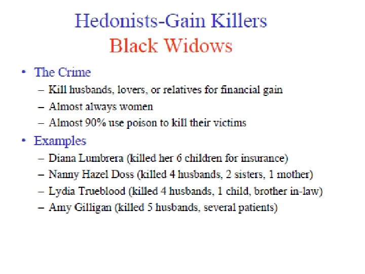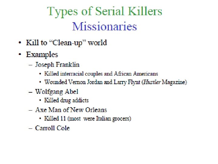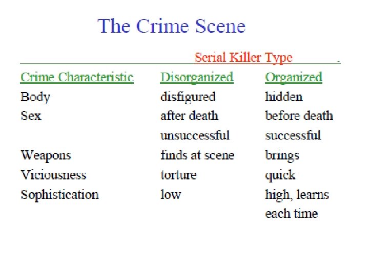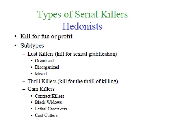 The Lust Murderer: subtype of a serial killer • Sadistic and brutal crime • Committed almost exclusively against women • Two types of offenders: – Organized Nonsocial – Disorganized Asocial
