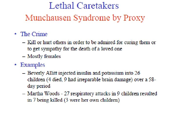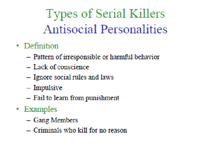 Disorganized Asocial • Post-mortem mutilation – Biting or slashing of breasts, genitals • Insertion of foreign objects – “an inquisitive child with a new toy” – Exploring how body works • Returns to crime scene often to continue mutilation