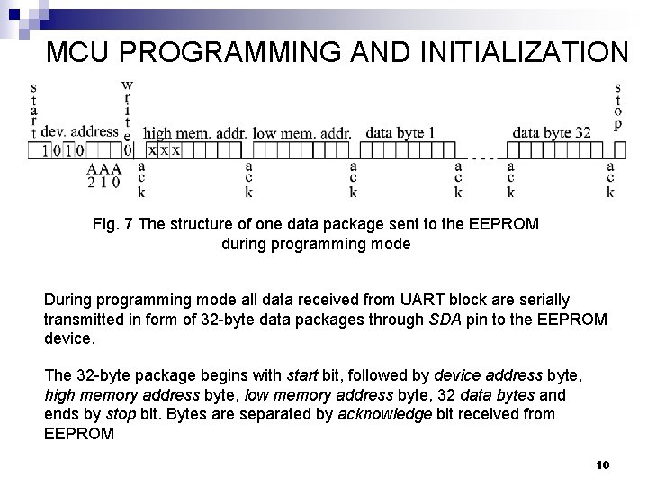 MCU PROGRAMMING AND INITIALIZATION Fig. 7 The structure of one data package sent to the EEPROM during programming mode During programming mode all data received from UART block are serially transmitted in form of 32 -byte data packages through SDA pin to the EEPROM device. The 32 -byte package begins with start bit, followed by device address byte, high memory address byte, low memory address byte, 32 data bytes and ends by stop bit. Bytes are separated by acknowledge bit received from EEPROM 10