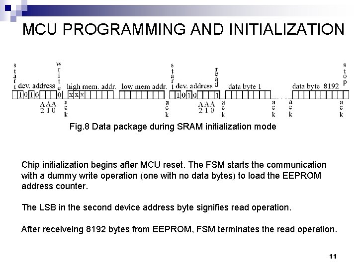 MCU PROGRAMMING AND INITIALIZATION Fig. 8 Data package during SRAM initialization mode Chip initialization begins after MCU reset. The FSM starts the communication with a dummy write operation (one with no data bytes) to load the EEPROM address counter. The LSB in the second device address byte signifies read operation. After receiveing 8192 bytes from EEPROM, FSM terminates the read operation. 11
