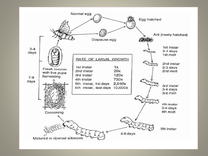 Life History of Mulberry silk worm (Bombyx mori) • The moths mate and the female lays more than 350 eggs. The moths then die • In the wild this cycle occurs once a year, but under scientific breeding it can occur up to three times in a year • In the Life cycle of Silkworm there are four stages i. e. Egg, Larva, Pupa and Adult • The eggs develop into the silkworm lava, grub or caterpillar. They eat for 20 -30 days, consuming large amounts of mulberry leaves The caterpillar moults through four changes of skin
