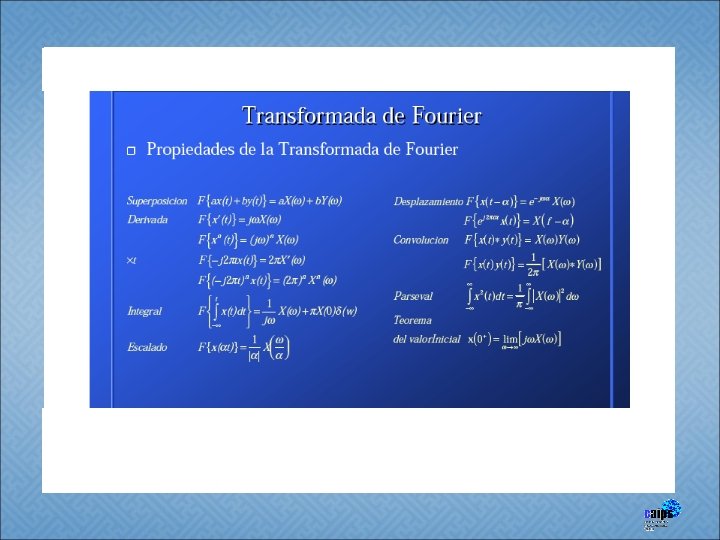 De la Serie a la Transformada de Fourier Si el periodo del tren de pulsos aumenta: 1. 5 p=1, T=2 f(t) 1 0. 5 0 -20 -10 1. 5 t 0 10 20 p=1, T=5 f(t) 1 0. 5 0 -20 -10 0 t 1. 5 p=1, T=10 f(t) 1 0. 5 0 -20 -10 1. 5 t 10 20 0 t 10 20 p=1, T=20 1 f(t) 0 0. 5 0 -20 -10