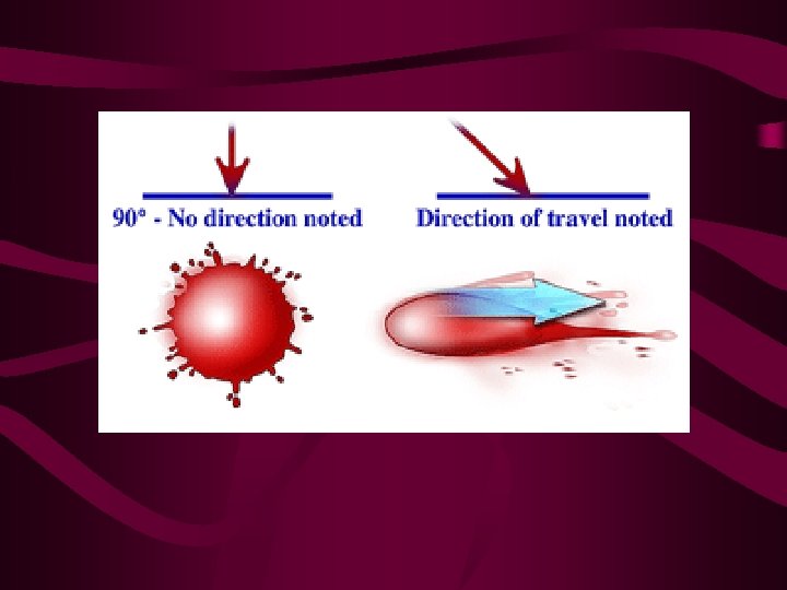 Stain patterns of blood • It is possible to determine the impact angle of blood on a flat surface by measuring the degree of circular distortion of the stain. A drop of blood striking a surface at right angles gives rise to a nearly circular stain: as the angle decreases, the stain becomes elongated in shape.