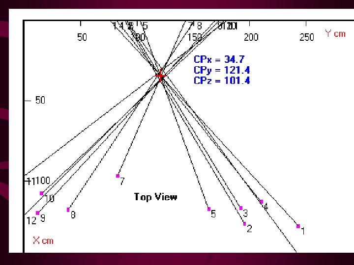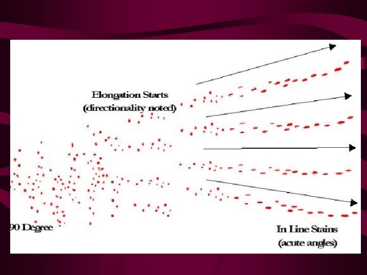 Stain patterns of blood • The origin of a blood spatter in a two – dimensional configuration can be established by drawing straight lines through the long axis of several individual blood stains. The intersection or point of convergence of the lines represents the point from which the blood came from.