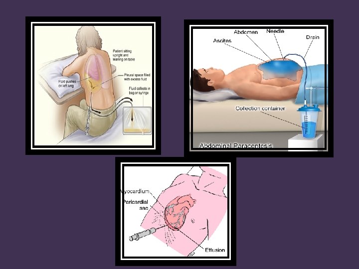 Pericardial effusion • Pericardial effusion is usually caused by: 1. Infection: Which may be bacterial, tuberculosis, fungal or viral. 2. Neoplasm: Which may be due to metastatic carcinoma or lymphoma. 3. Myocardial infarction. 4. Hemorrhage due to trauma. 5. SLE. Sample collection called pericardiocentesis