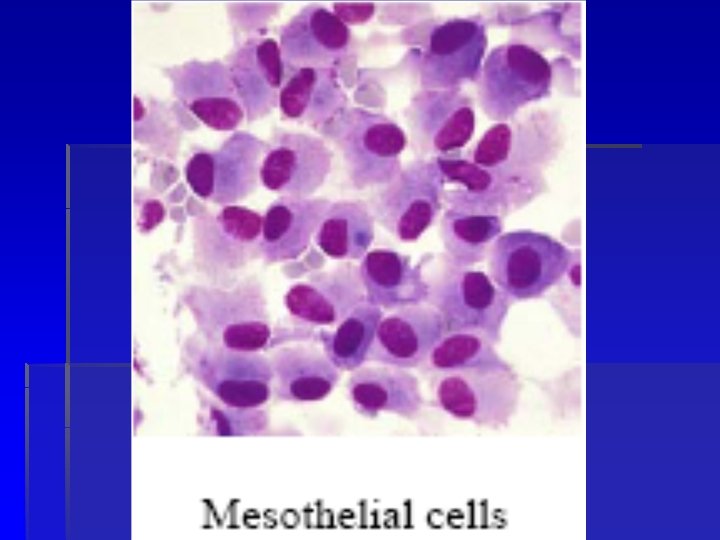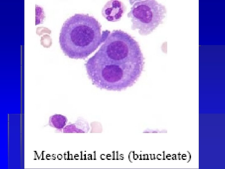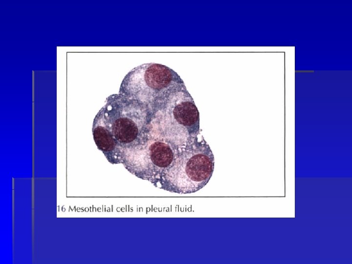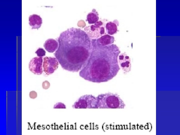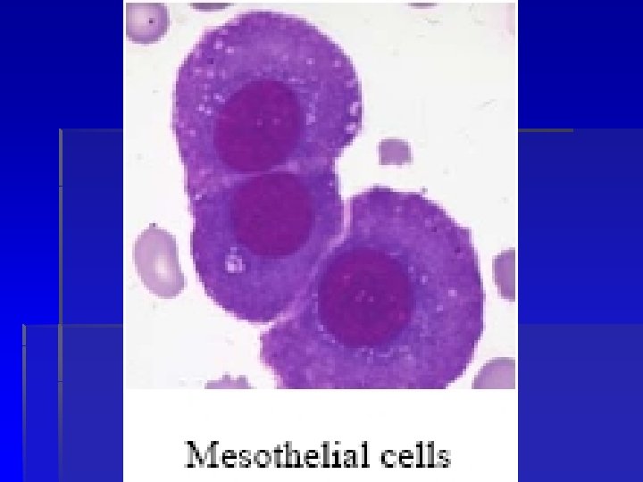 Serousal Fluids Pleural Fluid § Mesothelial cells: Are common in pleural fluid from inflammatory process. * Rare in patients with Tb pleurisy, empyema, RA and patients who have pleurodesis * Fibrin deposition and fibrosis occurring in these conditions prevent exfoliation of mesothelial cells * Carcinoma cells may form easily recognized tumor clusters or closely mimic mesothelial cells a panel of immunocytochemistry stains may be necessary for conformation