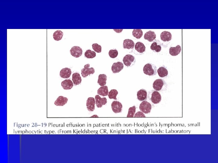 Serousal Fluids Pleural Fluid § Neutrophils: Predaminate in pleural fluid with inflammation. Over 10% of transudates also have a predominance of neutrophils but has no clinical significance § Lymphosytes: Associated with transudate and no clinical significance * Most are small but medium, large and reactive variants may be seen * Nuceloi and nuclear cleaving are more prominent in effusions than in prepheral blood * Low grade NHL or CLL may be difficult to distinguish from benign lymphocyte-rich serous effusions. In conjunction with cellular morphology, immunophenotyping by flowcytometry or immunocytochemistry is usually helpful