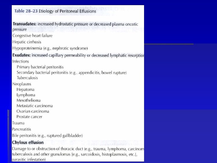 Serousal Fluids Peritoneal Fluid § Amylase activity in normal peritoneal fluid is similar to blood levels § A fluid amylase level greater than three times of serum value is good evidence of pancreas-related ascitis and also in GI perforation § Increased peritoneal BUN and Cr + increased serum BUN + normal serum Cr (due to back diffusion of urea) suggests bladder rupture § CEA sensitivity 40 -50% specificity 90% using cut off point of 3 ng/ml § Increase CEA in peritoneal washing suggest a poor prognosis of gastric Ca § CA-125 extremely high in epithelial Ca of ovary, follopian tube or endometrium