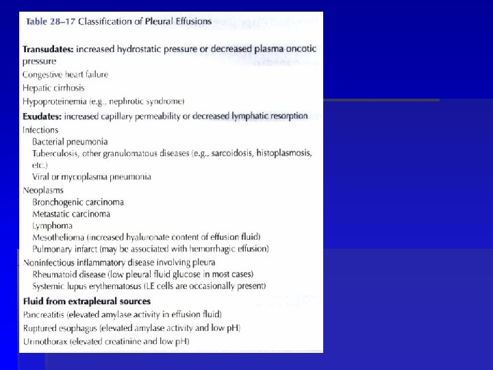 Serousal Fluids Transudate Appearance Clear Specific gravity < 1. 015 Total protein < 3. 0 gr/dl F/S protein ratio < 0. 5 LD < 200 IU F/S LD ratio < 0. 6 Cell count < 1000/ul Spontaneous clotting No Exudate Cloudy > 1. 015 > 3. 0 gr/dl > 0. 5 > 200 IU > 0. 6 > 1000/ul Yes • Total leukocyte and red cells counts are of limited use in the evaluation of serousal Fluids