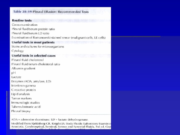 Serousal Fluids Pleural Fluid § Amylase: measurement of this enzyme is recommended for all pleural effusions with unknown ethiology Increased levels found in esophageal rupture § PH value > 7. 3 is related to uncomplicated cases § PH < 7. 2 is related to complicated cases such as bacterial pneumonia, Tb or malignancy § PH < 6. 0 is characteristic of esophageal rupture § Pleural fluid TG > 110 mg/dl indicate a chylous effusion § Values between 60 -110 mg/dl are less certain and require lipoprotein electrophoresis for chylomicrons § Pleural fluid TG < 50 mg/dl indicate a pseudochylous effusion, seen in chronic inflammatory process § Adenosine deaminase (ADA) is a rapid chemical evidence of Tb. ADA-2 from lymphocytes