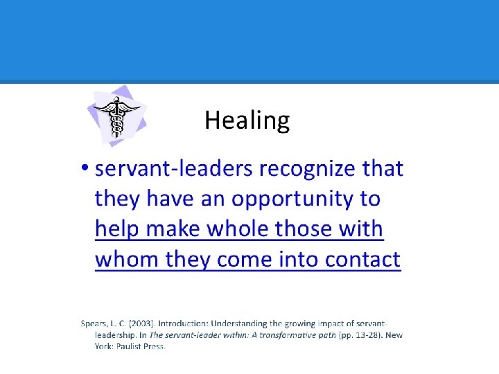 References Publications referenced, paraphrased or extracted from include the following: Autry, James A. ; The Servant Leader: How to Build a Creative Team, Develop Great Morale, And Improve Bottom-Line Performance. Three Rivers Press, New York, NY 2001. De. Graaf, Don; Tilley, Colin; Neal, Larry; Servant-Leadership Characteristics in Organizational Life. Greenleaf Center for Servant-Leadership. Westfield, Indiana. 2001. Greenleaf, Robert K. ; Servant Leadership: A Journey into the Nature of Legitimate Power & Greatness. Paulist Press, Mawah, NJ. 1977, 1991, 2002. Hansel, T. ; Holy Sweat. Word. Dallas, TX. 1987. Hunter, James C. ; The World’s Most Powerful Leadership Principle: How to Become a Servant Leader. Crown Business, New York, NY. 2004. Spears, Larry C. , Lawrence, Michelle (et al); Practicing Servant Leadership: Succeeding Through Trust, Bravery, And Forgiveness. Jossey-Bass, San Fransisco, CA. 2004 Spears, Larry C. ; Diary of Alpha Kappa Psi (article: Servant-Leadership). Gary L. Epperson, CAE. Spring 2008.