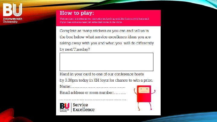 The Service Excellence Studio Insights into excellence Dr Jeff Bray, Faculty of Management – Waitrose Fellow David Biggins, Faculty of Management Paula Peckham, Faculty of Science & Technology Diana Leggott, IT Services Shane Wilson, Chartwells Professor John Vinney, Vice-Chancellor, Bournemouth University Drilling Systems RNLI