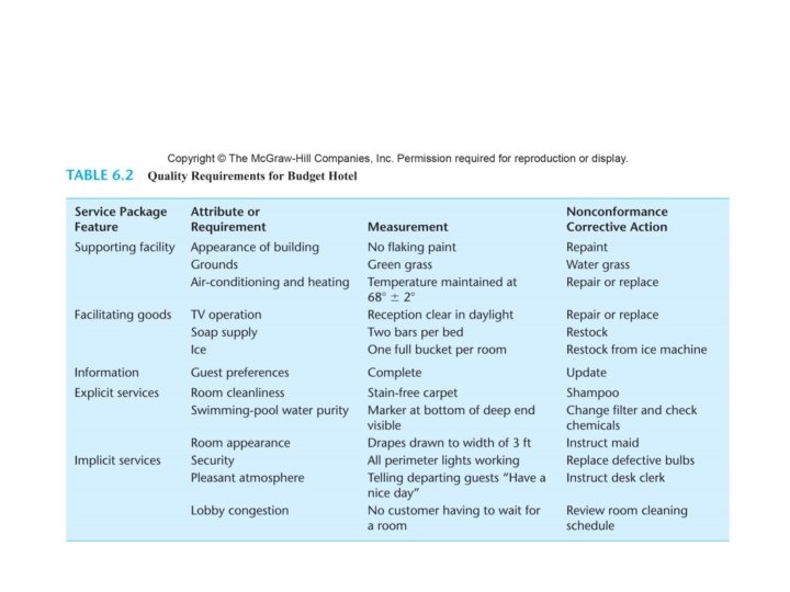 – Explicit service • Room has same appearance – Maids are trained to make up room in a standard manner – Implicit service • Employee with pleasant appearance and good interpersonal skill – Training in SOP – Recruit