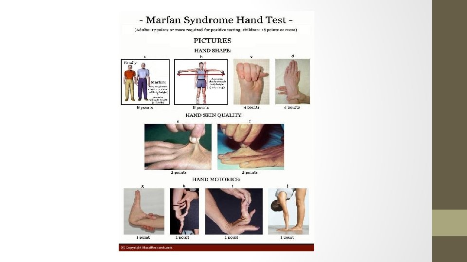 Examen Físico. • General: bien hidratada, bien perfundida. • Peso: 86, 6 kg Talla: 1, 83 mt • Piel y fanéreos: piel laxa, abundantes estrías en zona escapular y región mamaria. • Segmentario: • • Cabeza: normocráneo. Cara: alargada, simétrica, sin dismorfias. Paladar ojival. Tórax: algo excavado, simétrico, estrías anteriores y posteriores. Corazón: RR 2 T soplo eyectivo en foco aórtico. Pulmones: MP+ simétrico hasta las bases, sin ruidos agregados. Abdomen: plano, blando, depresible, indoloro, pequeña masa palpable en hipogastrio. Columna: sin alteraciones evidentes. Extremidades: aracnodactilia, brazos largos, delgados, hiperlaxitud ligamentaria. 4º ortejo izquierdo montado.