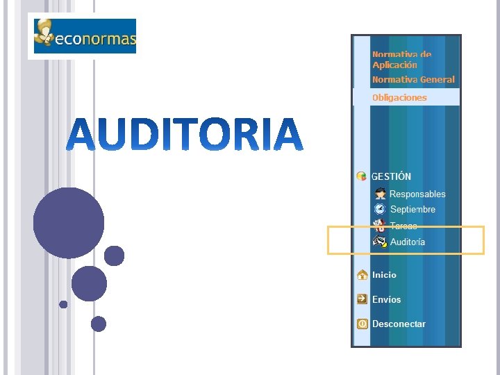 AUDITORÍA Para realizar la auditoría hay que insertar el ESTADO, los COMENTARIOS, y los REGISTROS que evidencian su estado Gestión del estado de cumplimiento de las obligaciones auditables Posibilidad de incluir comentarios y referencias a registros