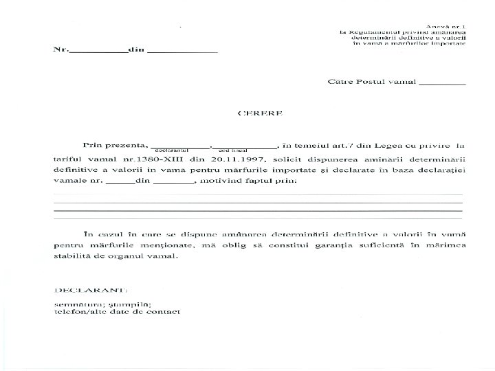 Solicitarea procedurii de amînare a stabilirii valorii în vamă cu caracter definitiv Amânarea determinării definitive a valorii în vamă se efectuează la cererea declarantului. Modelul cererii este stabilit prin Regulamentul privind amînarea determinării definitive a valorii în vamă a mărfurilor importate, aprobat prin Ordinul Serviciului Vamal nr. 445 -O din 17. 10. 2014.